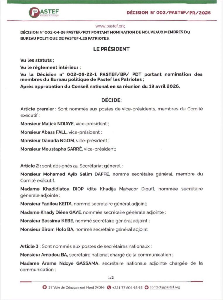 Le Secrétariat général, considéré comme le moteur administratif de la formation, connaît également un profond renouvellement. Mohamed Ayib Salim Daffé, actuel président du groupe parlementaire Pastef, a été désigné à sa tête. Il sera assisté par cinq adjoints : Khadidiatou Diop, Fadilou Keita, Khady Diène Gaye, Bassirou Kebe et Birom Holo Ba.
