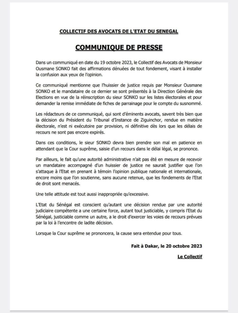 Selon le Collectif des avocats de l’État, la décision du Président du Tribunal d’Instance de Ziguinchor en matière électorale est en cours d’examen, et le délai de recours n’étant pas expiré, cette décision n’est ni définitive ni exécutoire par provision. En outre, les avocats de l’État ont annoncé que la présence de l’huissier de justice de M. Ousmane Sonko, accompagné de son mandataire, ne saurait justifier une quelconque attaque de l’État de droit.
