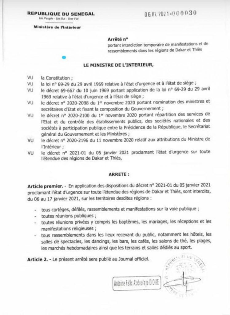 Ceux qui prévoyaient des cérémonies de mariage ou de baptême sont prévenus. Le ministre de l’Intérieur a précisé dans un arrêté publié ce jeudi, que sont «interdits, du 06 au 17 janvier 2021, sur les territoires desdites régions: tous cortèges, défilés, rassemblements et manifestations sur la voie publique; toutes réunions publiques; toutes réunions privées y compris les baptêmes, les mariages, les réceptions et les manifestations religieuses.»