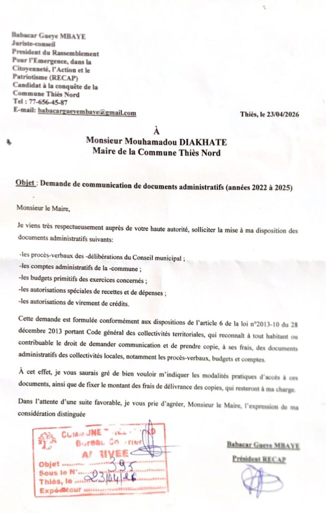 Nous informons l’opinion publique que, ce 23 avril 2026, nous avons officiellement déposé auprès de la Mairie de Thiès Nord une demande de communication de documents administratifs couvrant la période 2022 à 2025.