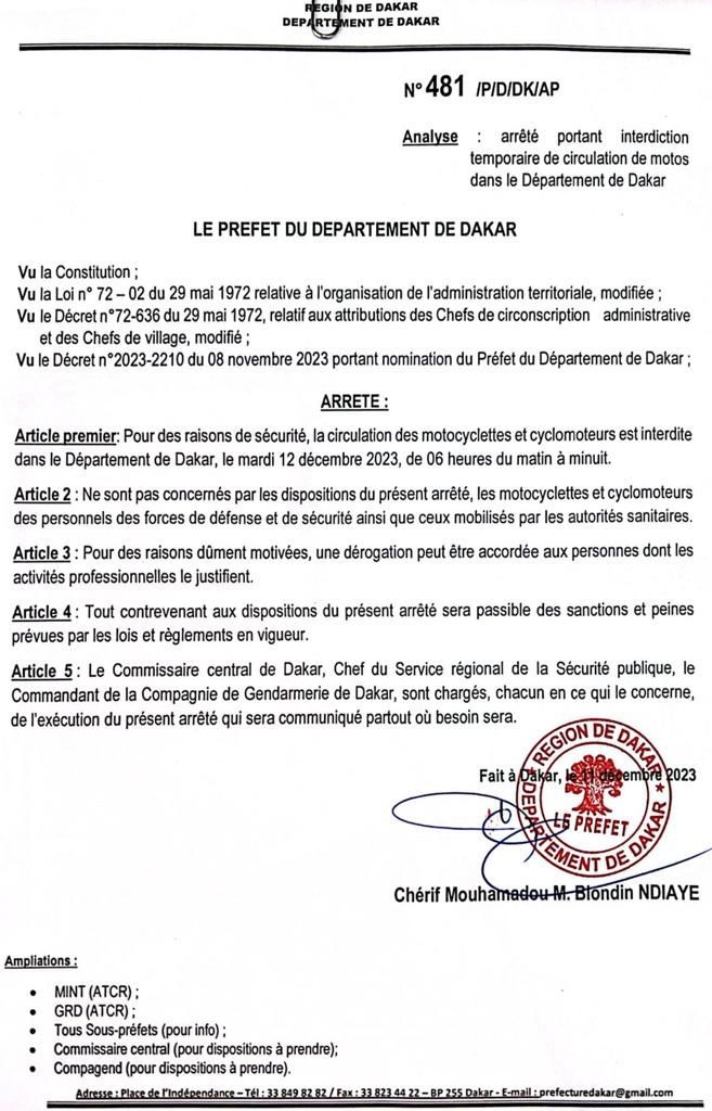 Pour des raisons de sécurité, la circulation des motocyclettes et cyclomoteurs est interdite dans le Département de Dakar, le mardi 12 décembre 2023, de 06 heures du matin à minuit, informe le préfet de Dakar.