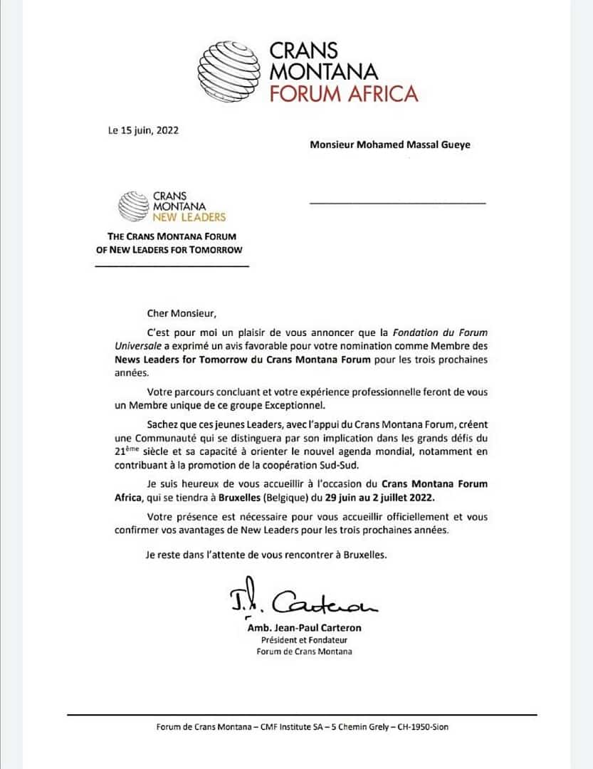 <span;>L’initiateur de plusieurs plate-formes associatives, professionnel de l’aéronautique et spatiale, entrepreneur depuis presque 3ans, Directeur général de Aero’Group Services , Mohamed Massal Guèye, a été sélectionné pour une seconde fois au cercle CM pour représenter le Sénégal à la septième édition du Forum Crans Montana des “nouveaux leaders du futur”, prévu du 29juin au 02 juillet 2022 à Bruxelles, Belgique, au Maroc. Le Forum de Crans Montana sur l’Afrique et la coopération Sud-Sud se réunit du 29juin au 02 juillet prochains, à Bruxelles , où de hauts décideurs du monde entier débattront des enjeux de l’Afrique et de son impact sur la croissance mondiale. Initié en 2015, le Forum décerne des prix à des jeunes, dénommés “nouveaux leaders du futur”, sélectionnés pour faire des communications sur des thèmes de leur choix. Le Forum du Crans Montana est présenté par son président-fondateur, Jean-Paul Carteron, comme “un véritable laboratoire d’un nouveau modèle de développement pour l’Afrique”. Le Sénégal y sera à nouveau, grâce à notre représentant Mohamed Massal Gueye.