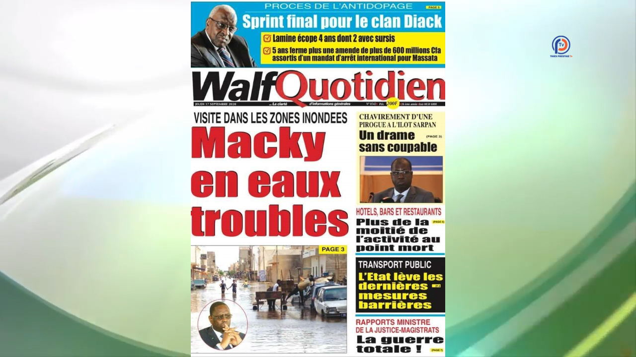 ’’Visite dans les zones inondées, Macky Sall en eaux troubles’’, affiche Walfadjri. ‘’C’est une visite sous haute tension que le chef de l’Etat va effectuer ce jour dans les zones inondées de la banlieue dakaroise. De Pikine à Keur-Massar (…), ce sont des populations en colère et prisonnière des eaux de pluie qui vont accueillir Macky Sall’’, écrit Walf.