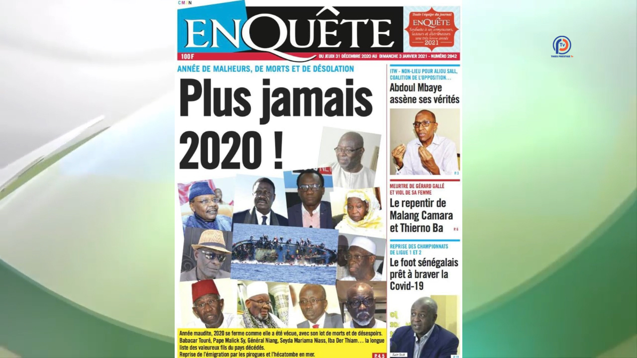 EnQuête montre à sa une les photos de plusieurs personnalités sénégalaises décédées en 2020 – pour d’autres causes que le Covid-19 pour certaines d’entre elles – et qualifie 2020 d’année “maudite”. Une “année de malheurs, de morts et de désolation”, avec “une économie quasiment à l’arrêt”, selon le même journal.