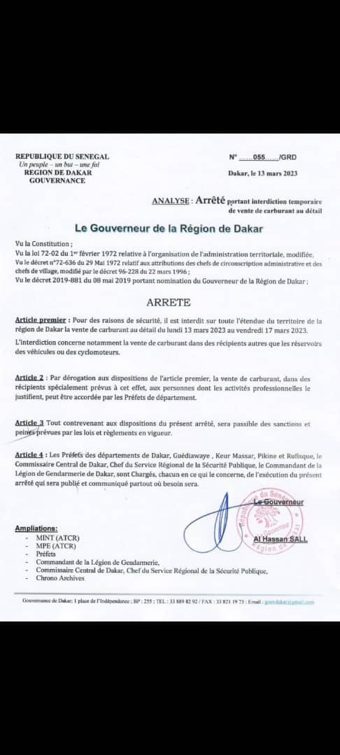 Le gouverneur de Dakar a, dans un arrêté, interdit la vente de carburant en détail sur toute l’étendue de la capitale sénégalaise du lundi 13 mars au vendredi 17 mars 2023, pour des raisons de sécurité, note-t-il.