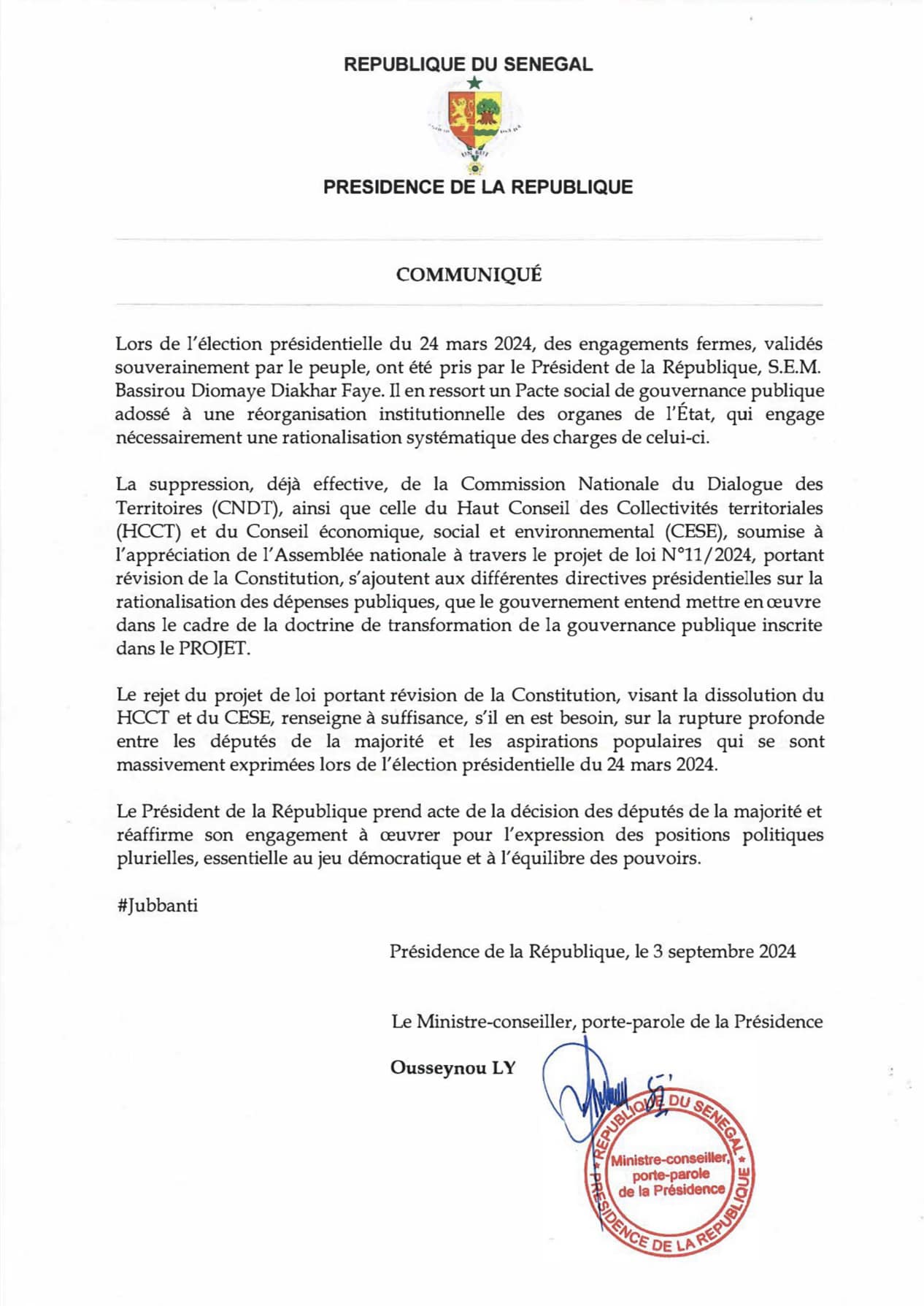 « Lors de l’élection présidentielle du 24 mars 2024, des engagements fermes, validés souverainement par le peuple, ont été pris par le Président de la République, S.E.M. Bassirou Diomaye Diakhar Faye. Il en ressort un Pacte social de gouvernance publique adossé à une réorganisation institutionnelle des organes de l’État, qui engage nécessairement une rationalisation systématique des charges de celui-ci », rappelle M. Ly.
