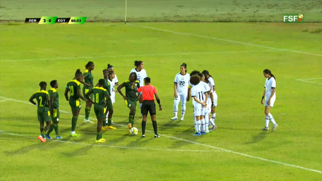 Mais pour autant de domination en attaque, les Lionnes ne se montraient pas totalement rassurantes en défense, puisque sur une longue relance égyptienne Laila Sherif s’est mise seule face à Adji Ndiaye, mais le Sénégal se sauve par un tacle plus que salvateur de la part de Wolimata Ndiaye (9e). Pour le plus grand plaisir du public, qui ovationne la nouvelle latérale droite de l’AS Bambey. A force de casser le rythme sénégalais, donc, l’Egypte remettait quelques frayeurs dans la défense sénégalaise, avec un centre fuyant d’Eldanbouki pour Ismaela, devancée de justesse par Adji Ndiaye (24e).