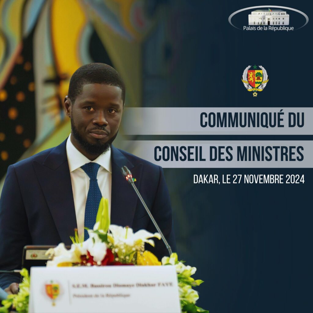 Le Chef de l’Etat, Son Excellence, Monsieur Bassirou Diomaye Diakhar FAYE a présidé, ce mercredi 27 novembre 2024, la réunion hebdomadaire du Conseil des Ministres, au Palais de la République.